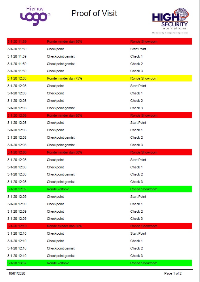 De rapportage voorziet in de belangrijke informatie over de rondes zoals, datum/tijd, naam en het resultaat van een ronde. De niet bezochte controlepunten zijn zichtbaar en het totale resultaat van een loopronde in % en een kleur is in één oogopslag duidelijk. Hiernaast zie je een voorbeeld van zo’n rapport.